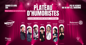 Le samedi 25 avril à 20h, Le Rotaract vous propose un plateau d’humoristes exceptionnel organisé en partenariat avec le What The Fun, afin de soutenir les activités du foyer Le Bocage.